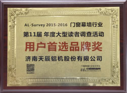 ???? 同期,由中國建筑金屬結構協(xié)會主辦,中國幕墻網承辦的“第十一屆AL-Survey2015-2016中國幕墻網年度大型讀者調查評選活動”頒獎儀式在在廣州廣交會威斯汀酒店隆重舉行,天辰股份榮獲“用戶首選品牌獎”。