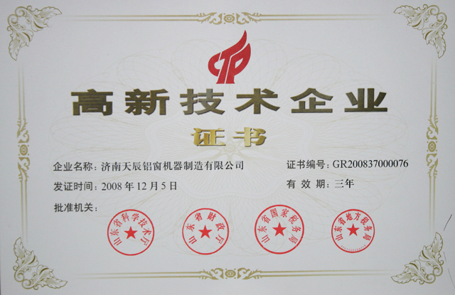 ??? 濟(jì)南高新區(qū)管委會(huì)召開了高新區(qū)2008年首批高新技術(shù)企業(yè)授牌大會(huì),并轉(zhuǎn)發(fā)了省科技廳、財(cái)政廳、省國(guó)稅局、省地稅局的認(rèn)定的通知,向區(qū)內(nèi)首批高新技術(shù)企業(yè)頒發(fā)了高新技術(shù)企業(yè)證書和銅牌。天辰鋁機(jī)公司被認(rèn)定位山東省2008年第一批高新技術(shù)企業(yè)。