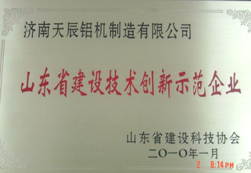 ??? 2010年2月26日山東省住房和城鄉(xiāng)建設(shè)廳在濟南南郊賓館召開全省建設(shè)科技工作會議,隆重表彰了全省建設(shè)科教工作和墻材革新建筑節(jié)能工作先進集體、先進個人,省建設(shè)技術(shù)創(chuàng)新獎評獎結(jié)果和省建設(shè)技術(shù)創(chuàng)新示范企業(yè)、建筑節(jié)能優(yōu)秀示范工程名單。天辰鋁機公司獲省建設(shè)技術(shù)創(chuàng)新示范企業(yè)。