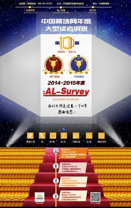 AL-Survey讀者調(diào)查活動(dòng)全稱:中國幕墻網(wǎng)年度大型讀者調(diào)查暨“我最喜愛品牌”評選活動(dòng)。(以下簡稱AL-Survey)我司濟(jì)南天辰鋁機(jī)股份有限公司作為門窗幕墻機(jī)械制造領(lǐng)域的資質(zhì)企業(yè),攜“天辰”品牌,強(qiáng)勢入圍本次調(diào)查活動(dòng)。通過活動(dòng)參與者的票