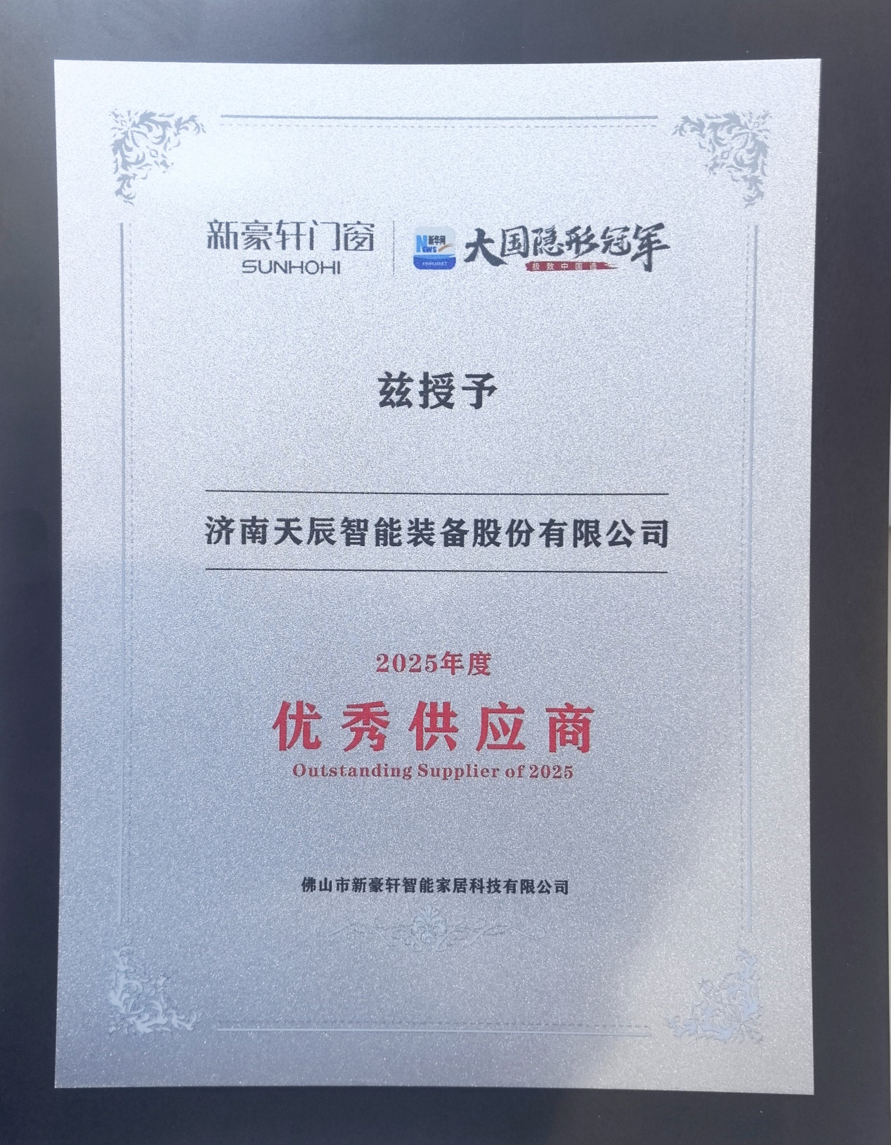 慶典晚宴上,天辰股份被正式授予「2025 年度優(yōu)秀供應(yīng)商」榮譽(yù)牌匾。這份認(rèn)可,是對(duì)天辰產(chǎn)品品質(zhì)、服務(wù)保障的高度肯定,更是雙方長(zhǎng)期攜手、互利共贏的有力見證。